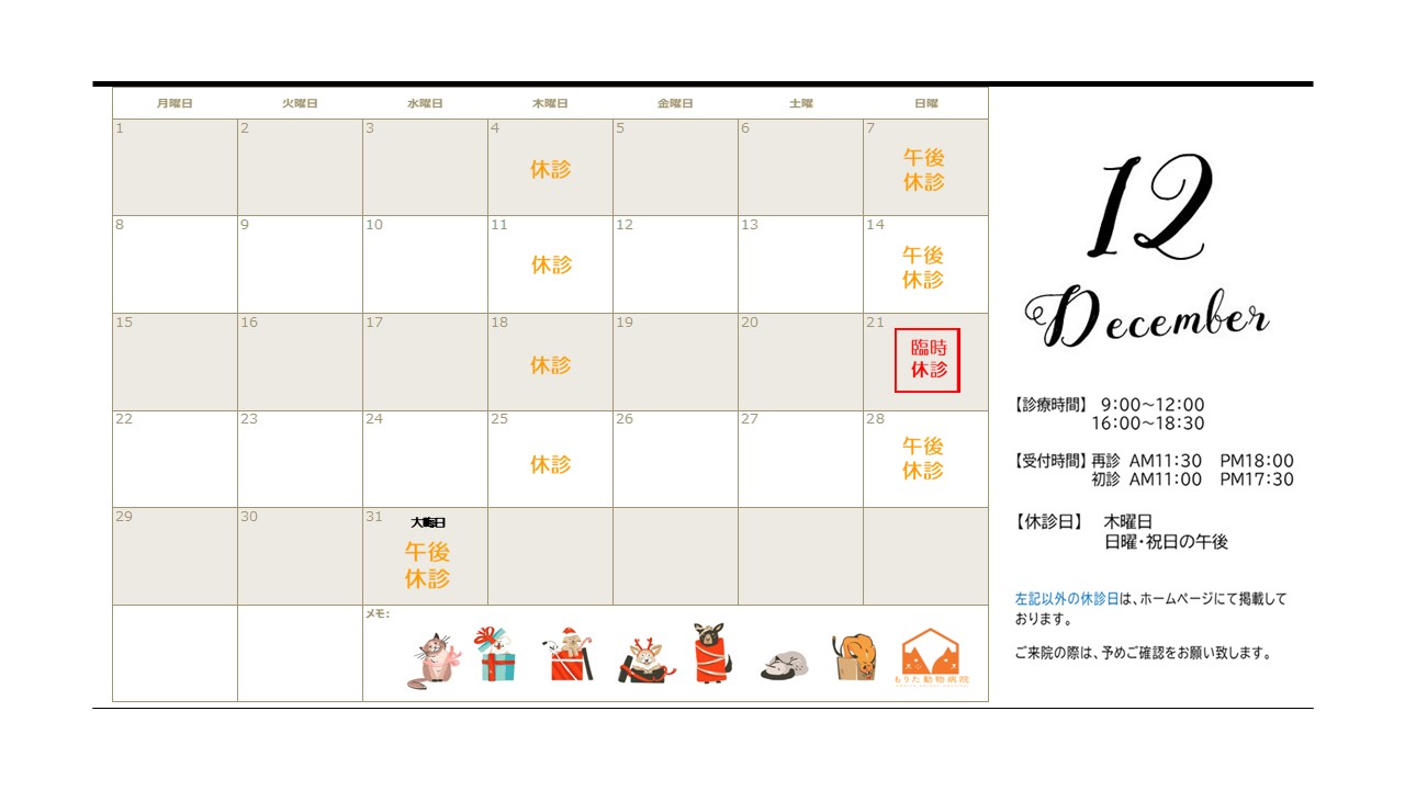 12月の診療カレンダー 2025年11月14日 外来診療のお知らせ こんにちは。もりた動物病院です。 12月の診療カレンダーを作成しました。ご来院の際は、予めご確認をお願いいたします。 詳細は、下記のポスターをご覧ください。