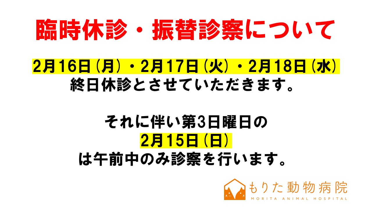 2026年2月16日(月)、2月17日(火)、2月18日(水)は終日臨時休診とさせていただきます。