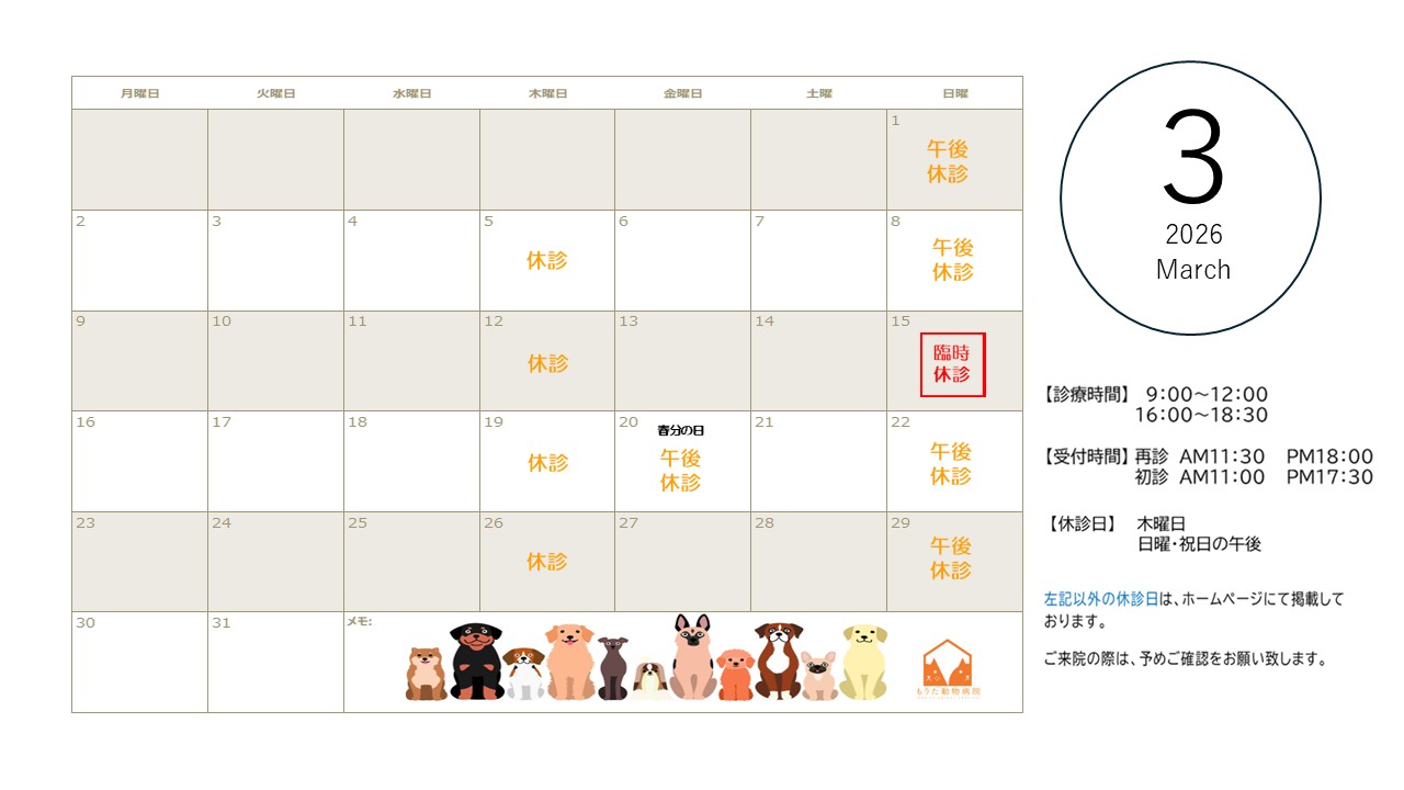 3月の診察カレンダー 2026年2月18日 外来診療のお知らせ こんにちは。もりた動物病院です。 3月の診療カレンダーを作成しました。ご来院の際は、予めご確認をお願いいたします。 詳細は、下記のポスターをご覧ください。